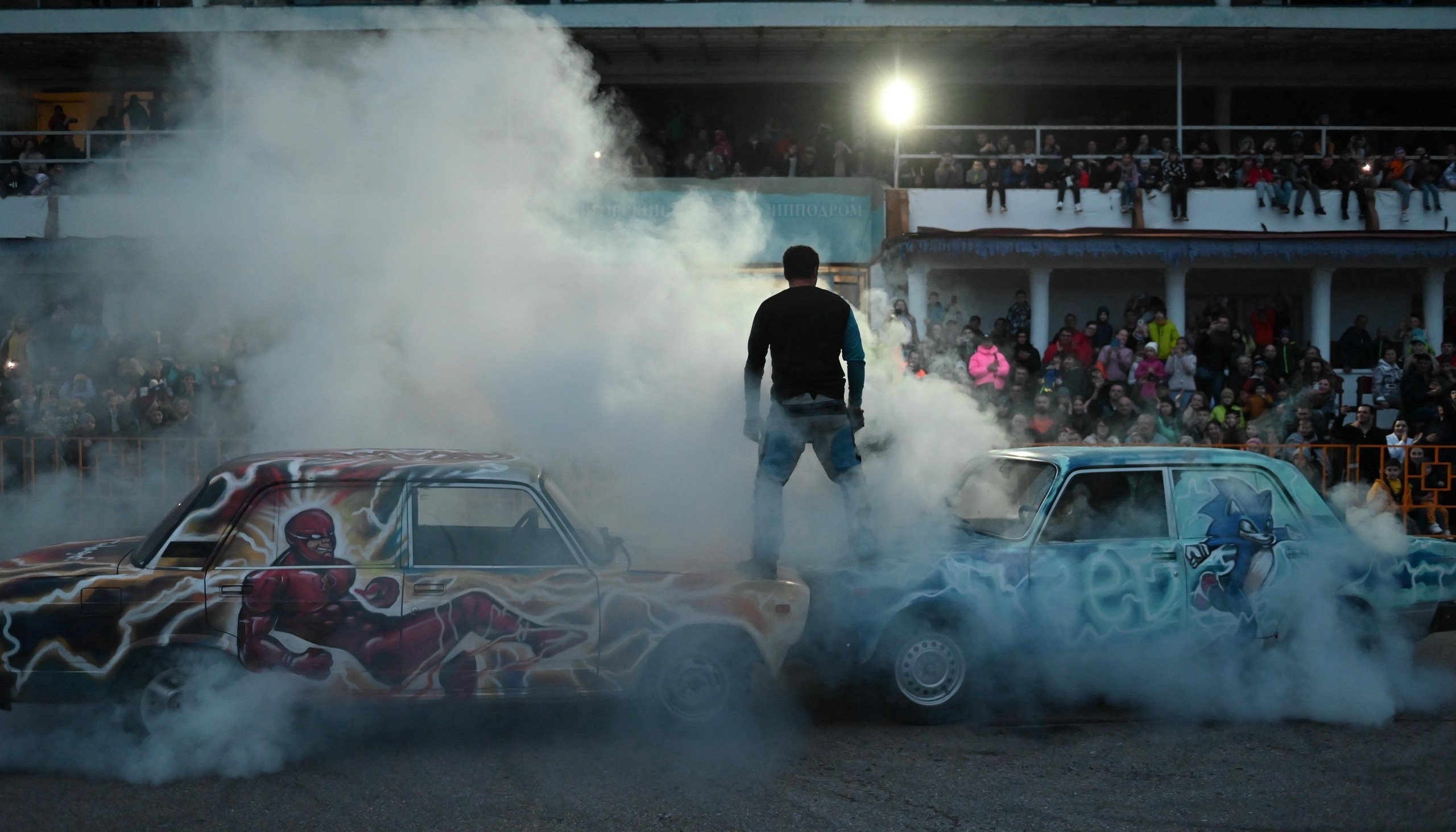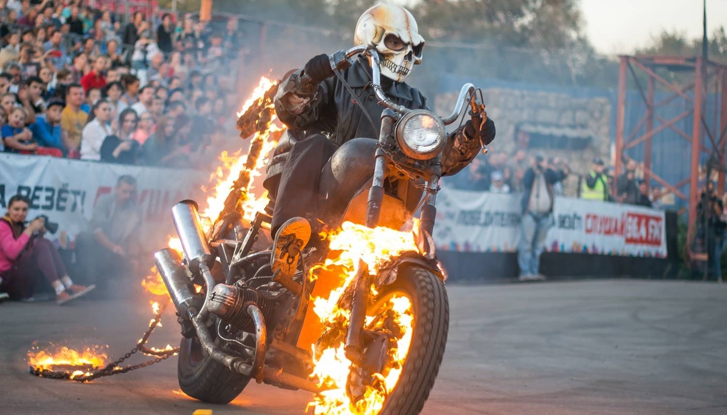 - Езда на двух колесах, автофристайл, пиротехнические спецэффекты.