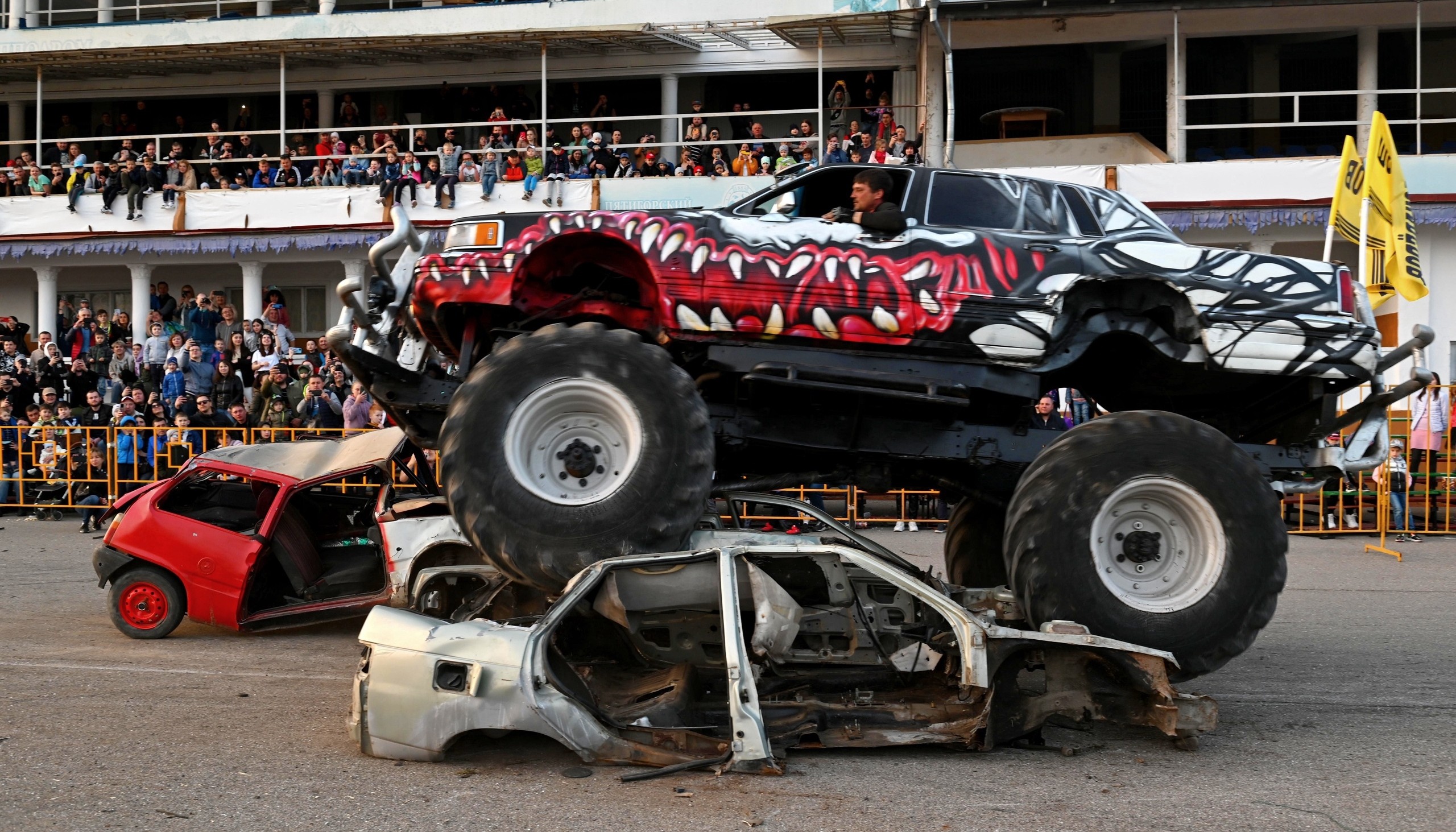 - Битва автомобилей, квадроциклы, бои легковых авто с Бигфутом, сбивание машин.
